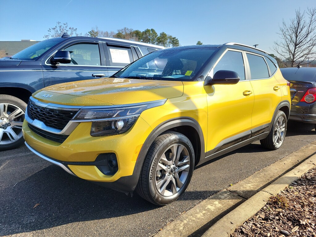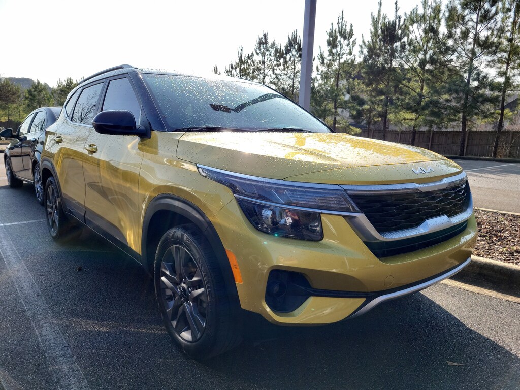 The 2023 Kia Seltos S boasts a striking exterior in a vibrant Yellow hue, complemented by a sleek Black roof for a bold, head-turning look. Step inside and discover a well-appointed cabin that caters to your every need, with features like Auto Dimming Mirror with HomeLink and Compass, and an Interior Light Kit that adds a touch of sophistication.